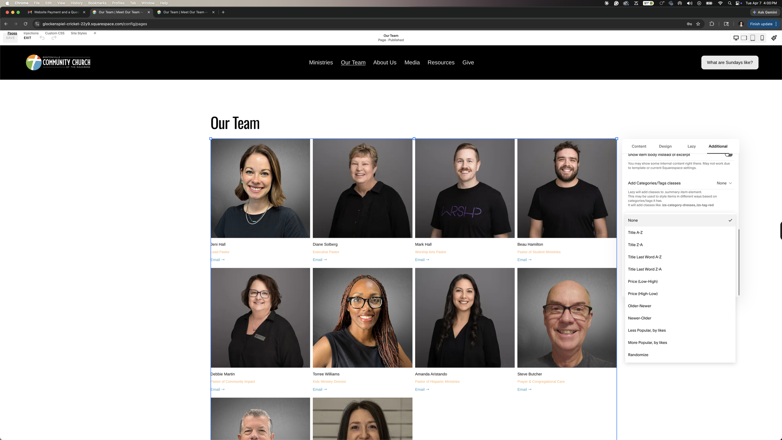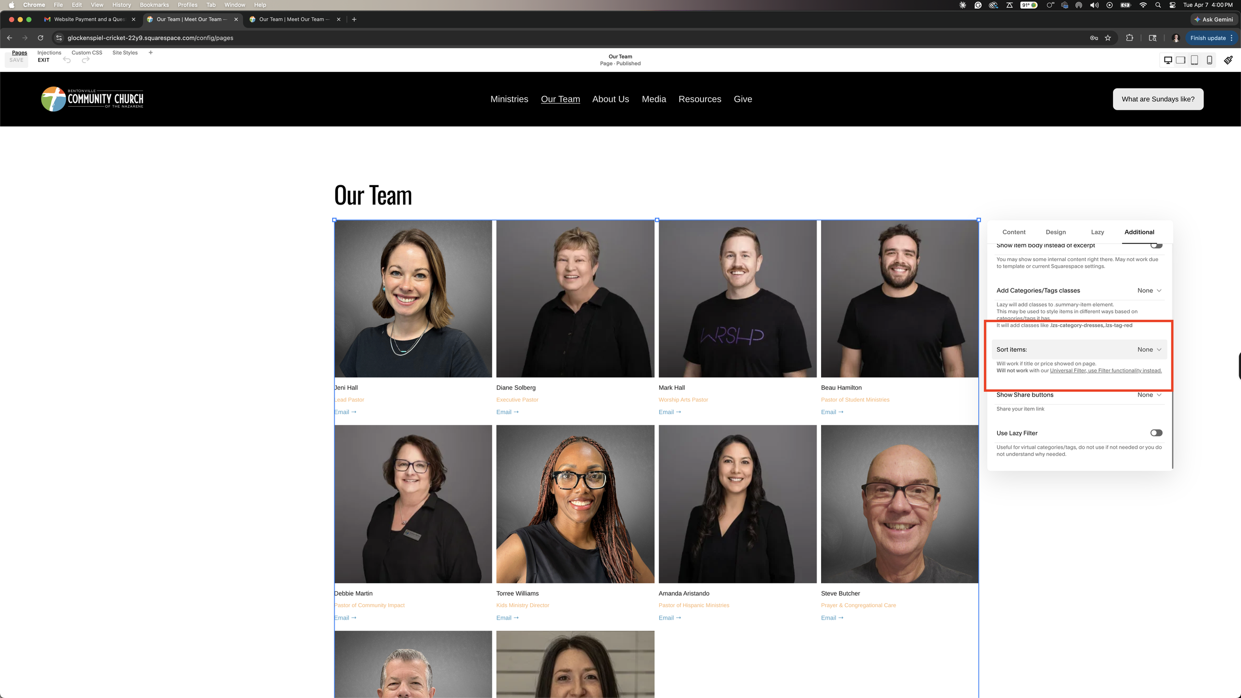 If you want to have them be alphabetically sorted, click the summary block in the “Our Team” page and go into the edit settings. Click “additional” and find “Sort Items”(this is in the red box above). Click “Title A-Z” for first name sorting and “Title Last Name A-Z” for last name sorting.